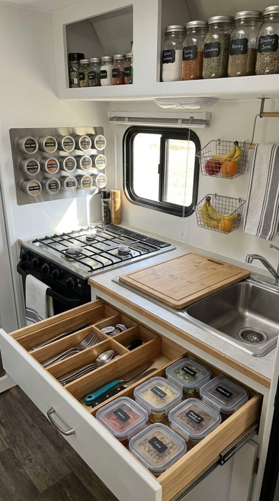 The kitchen is often the most challenging area to keep organized in an RV. Implement smart solutions like magnetic knife strips mounted on walls, drawer dividers for utensils, and stackable shelf organizers to maximize cabinet space. Over-the-sink cutting boards create extra prep space without permanent installation, while hanging baskets underneath cabinets provide convenient storage for fruits and vegetables. Label containers to make finding ingredients quick and easy, and use clear storage bins so you can see contents at a glance.