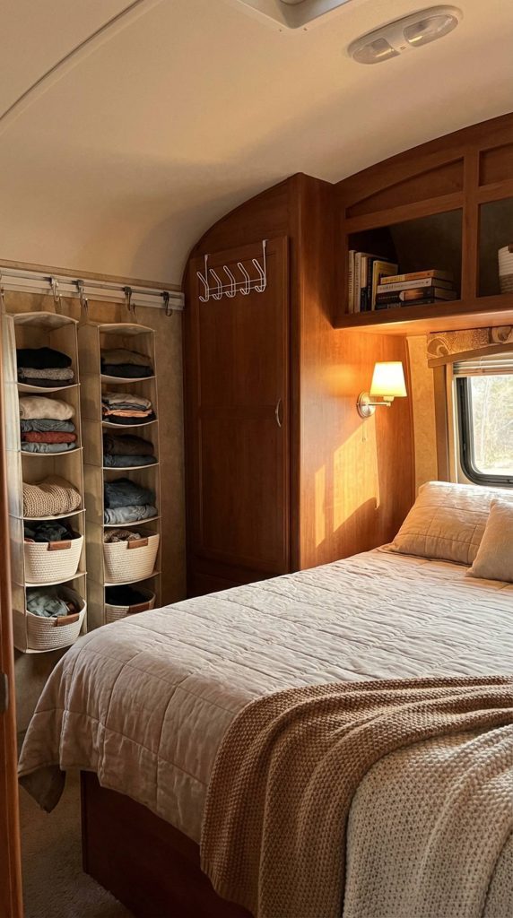 Stackable storage containers are another excellent vertical solution for closets and cabinets. Clear bins allow you to see contents at a glance, while uniform sizes create a neat, organized appearance. Don’t forget about the space above cabinets and under beds—these often-overlooked areas are perfect for storing seasonal items or things you don’t need daily. By maximizing vertical storage, you’ll be amazed at how much you can fit in your 5th wheel without feeling cramped.