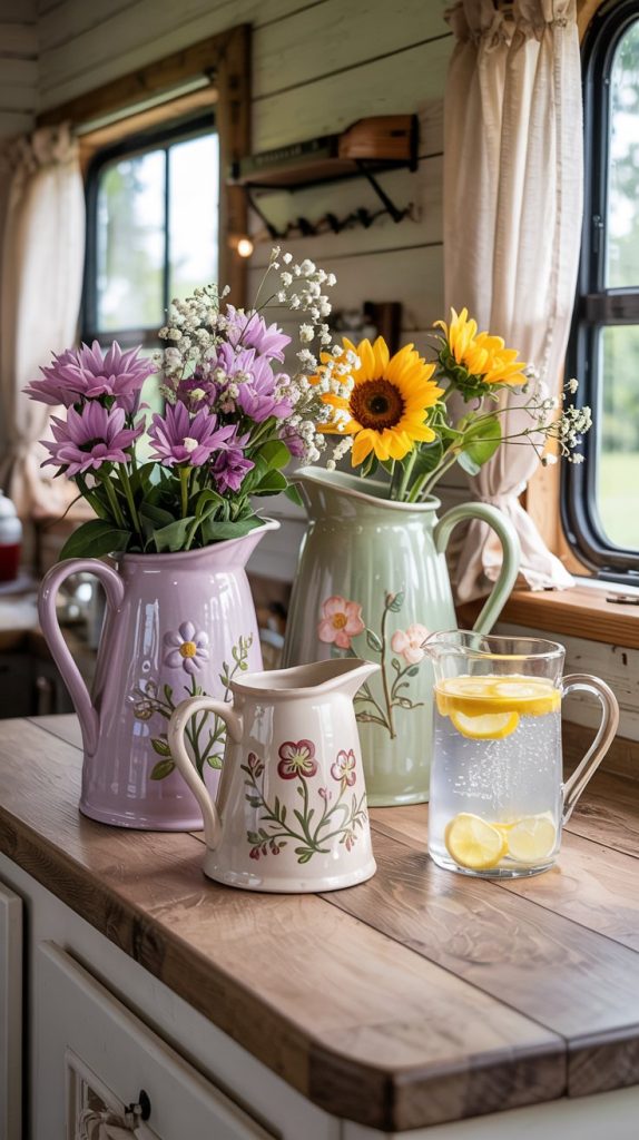 Ceramic pitchers are both beautiful and practical in a French country RV. Use them for serving drinks, displaying fresh flowers, or as a decorative accent on your countertop.
