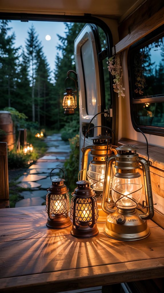 Lanterns add a warm, ambient glow to your RV, perfect for cozy evenings. Choose lanterns with antique finishes and glass panels for a French country look.