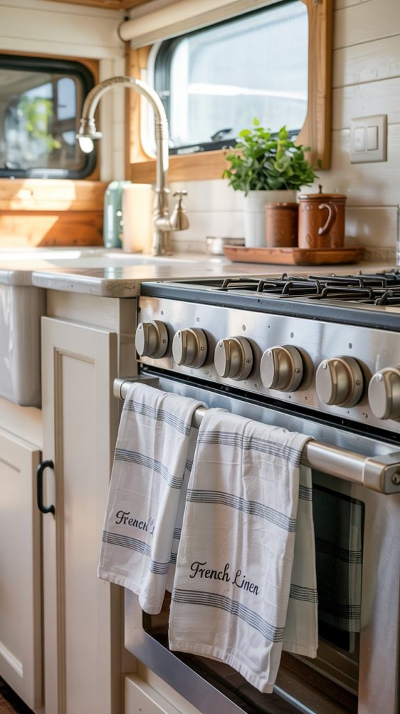 Upgrade your RV kitchen with French linen tea towels. They’re absorbent, durable, and get softer with each wash.