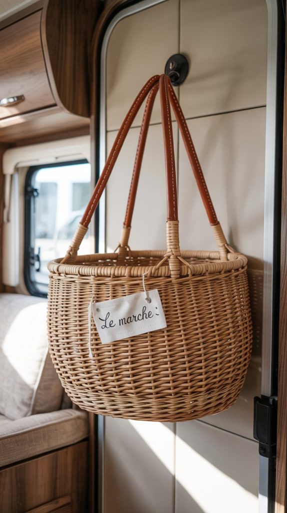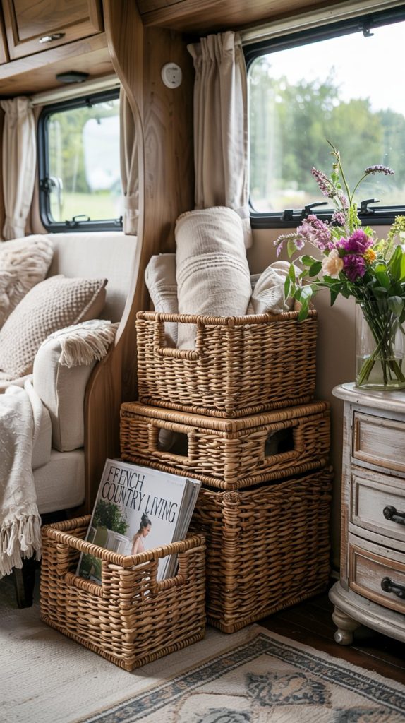 Keep your RV tidy and stylish with woven baskets. Not only do they offer practical storage, but their natural textures and earthy tones fit perfectly with French country aesthetics.