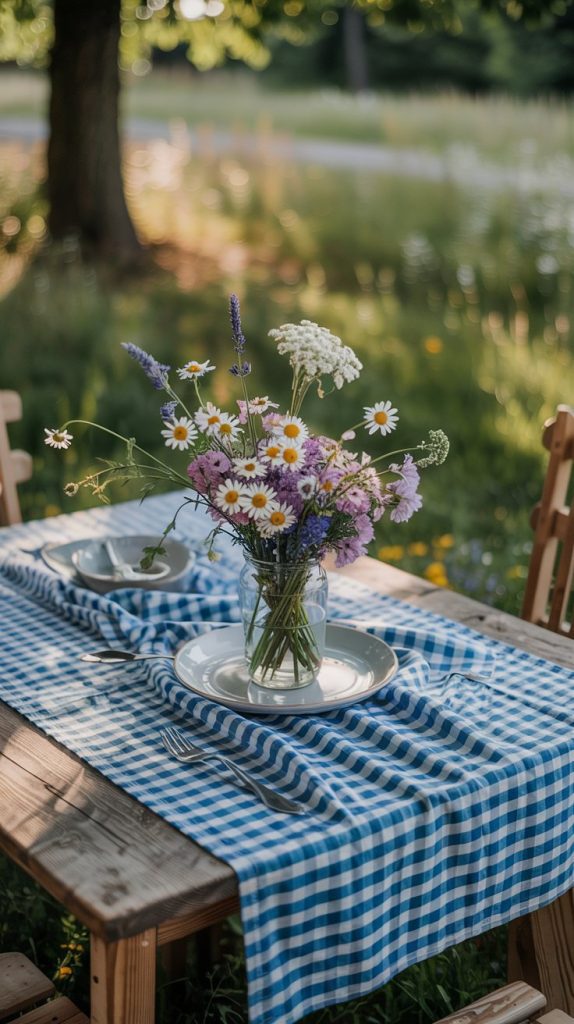 Choose a tablecloth in soft blues, reds, or neutrals. Pair it with simple dishware and wildflowers for a charming, effortless look.