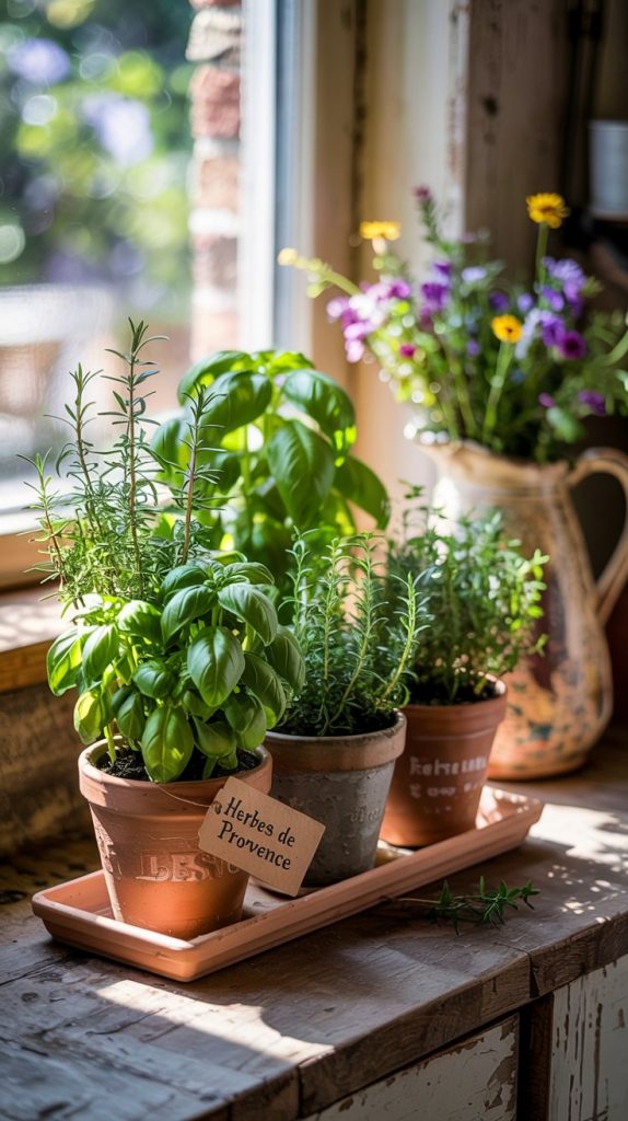 Basil, rosemary, and thyme are easy to grow and essential for French cooking. Use decorative ceramic or galvanized pots to add style and keep your herbs within reach.