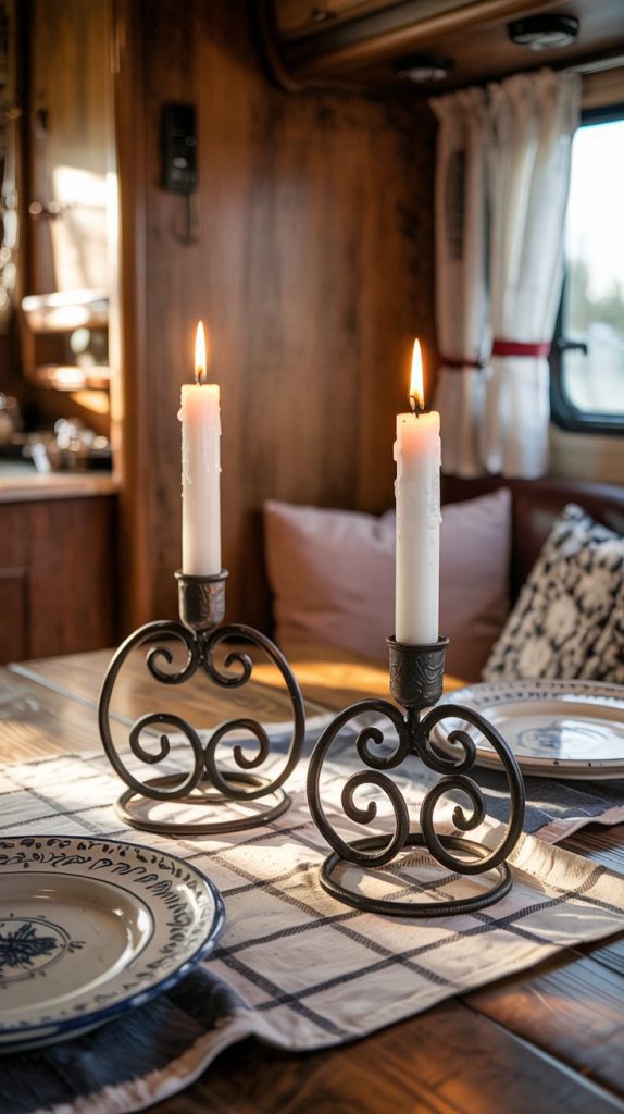 Place them on your RV dining table or mantle. Use unscented candles for a gentle, flickering glow that enhances the cozy atmosphere.