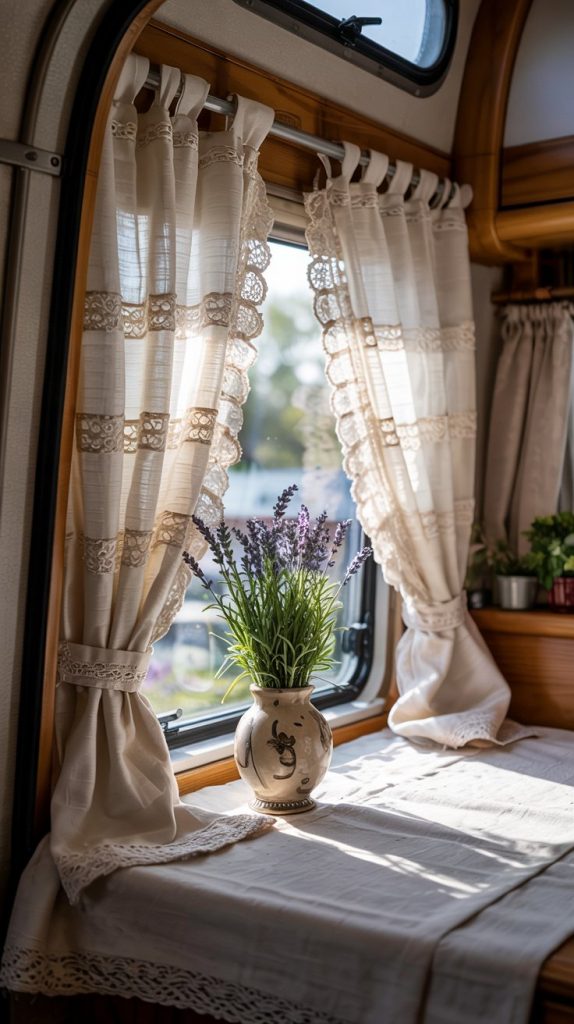 Soft, lacy curtains filter sunlight beautifully and add a romantic feel to your RV. They’re easy to hang and instantly make any window look more inviting.
