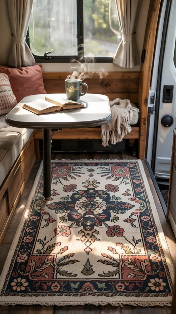 Place a rug in your RV living area or under your dining table. It’s an easy way to define spaces and add comfort to your RV.