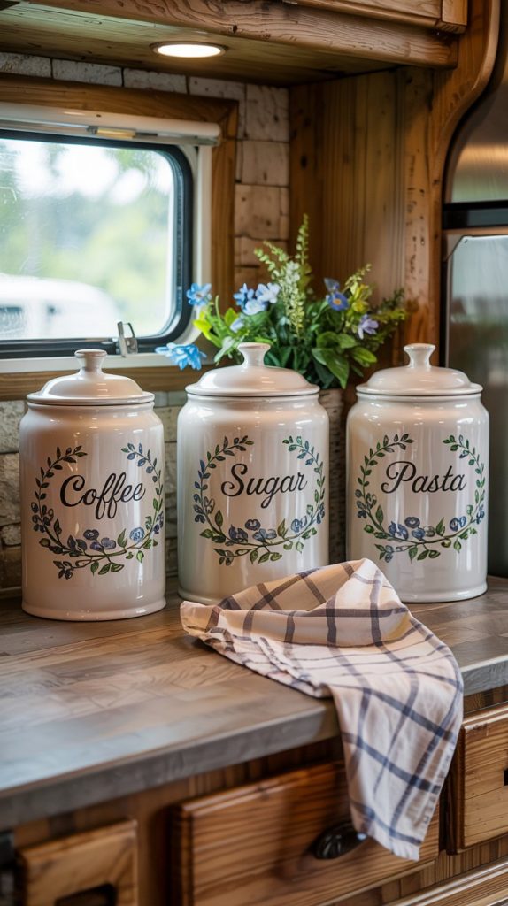 Use them to store coffee, sugar, or pasta. They’re practical and add a touch of old-world elegance to your RV kitchen.