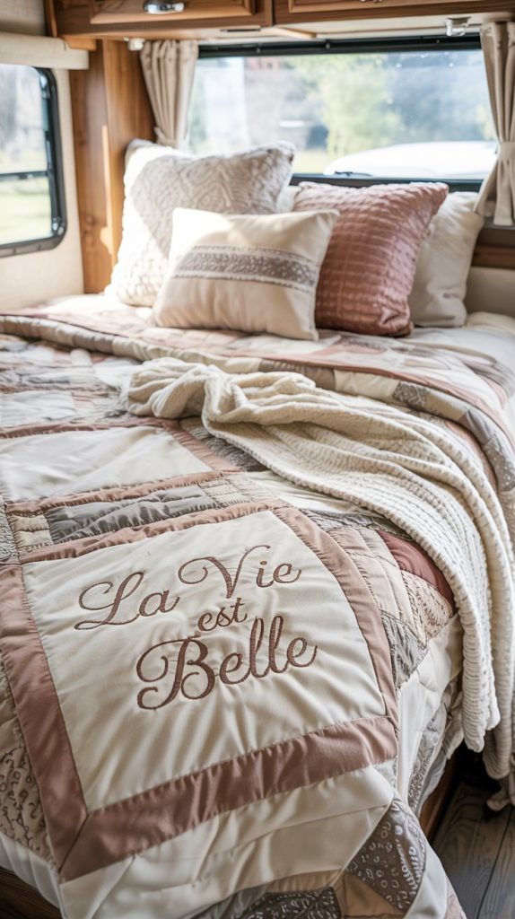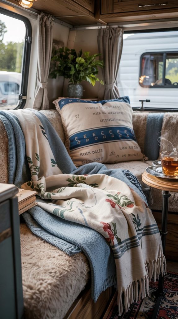 A classic French country RV starts with comfort, and nothing says comfort like a pile of vintage-inspired throw blankets. Choose soft fabrics in muted colors—think faded blues, gentle creams, and subtle florals—that evoke the relaxed elegance of a French cottage. Drape them over your sofa or bed for instant coziness and visual appeal.