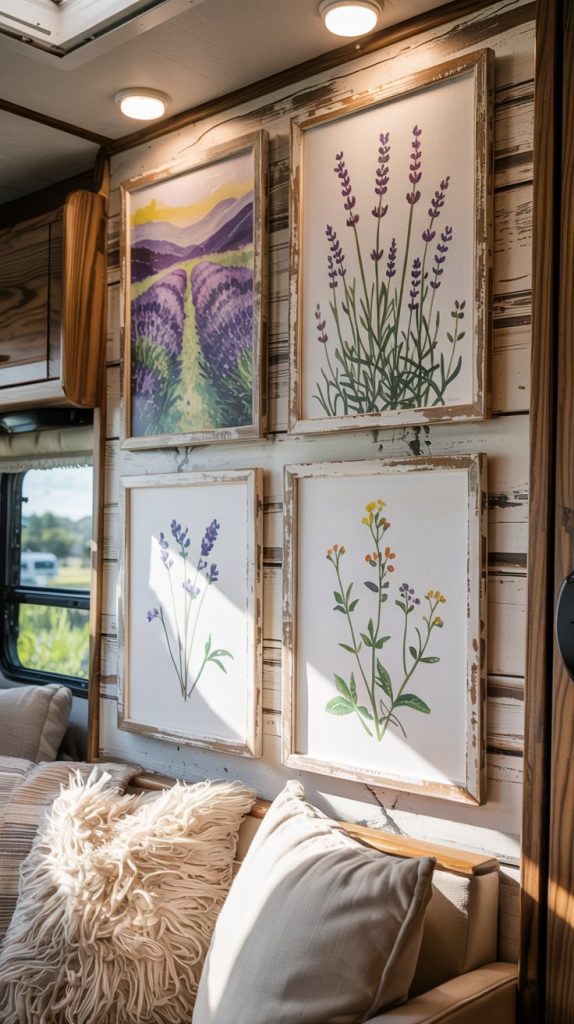 Decorate your RV walls with botanical prints or paintings. Choose images of lavender, wildflowers, or herbs for a classic French country vibe.