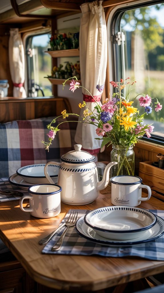 Enamelware dishes are durable, lightweight, and undeniably charming. Their vintage appeal makes them a perfect fit for a French country RV, and they’re ideal for both indoor and outdoor dining.