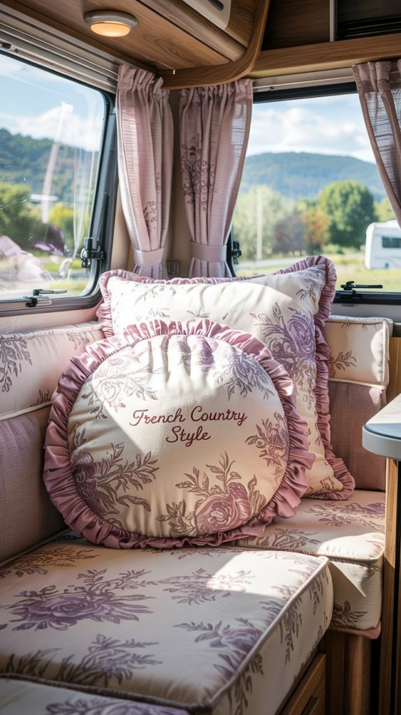 Add a splash of color and comfort with floral print cushions in your RV. French country style is all about soft, inviting patterns, so choose cushions with delicate florals or toile designs in pastel shades.