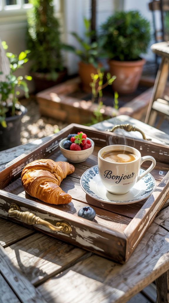 Rustic wooden serving trays are a staple of French country decor, perfect for breakfast in bed or serving snacks outside your RV. Look for trays with distressed finishes and ornate handles to capture that farmhouse feel.