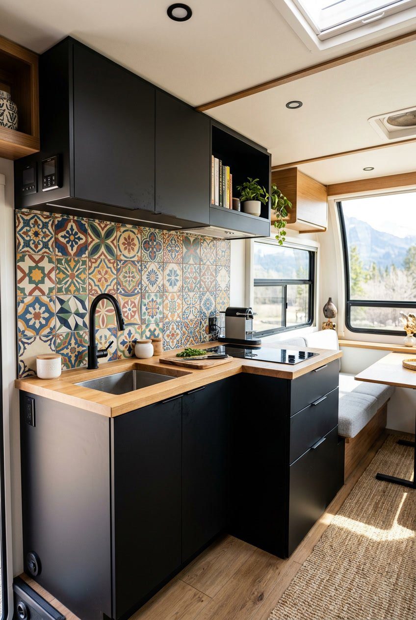The beauty of using patterned tile with black cabinets is that the dark cabinetry grounds the space and prevents the colorful patterns from feeling overwhelming or chaotic. The black acts as a visual rest area that balances the busy tiles and creates a cohesive overall design. This approach works particularly well for creative types who want their RV to reflect their artistic personality while maintaining an underlying sophistication. Pull accent colors from your patterned tile into other elements – dish towels, small appliances, or even bar stools – to create a coordinated look.