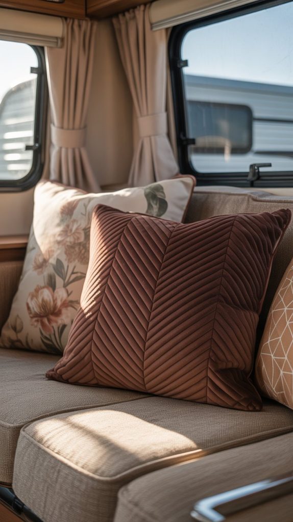 Accent pillows in various shades of brown, featuring patterns like chevron, floral, or geometric prints, add personality and comfort to your RV seating and sleeping areas. Mixing solid and patterned pillows creates visual interest.