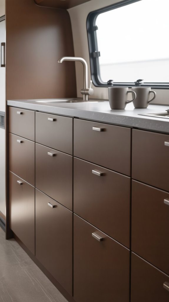 Brown cabinetry in matte finishes offers a modern yet cozy feel to your RV kitchen or bathroom. Matte surfaces reduce glare and fingerprints, maintaining a clean look during travel. Choose cabinetry in medium to dark brown shades to anchor your space and contrast with lighter countertops or backsplashes.