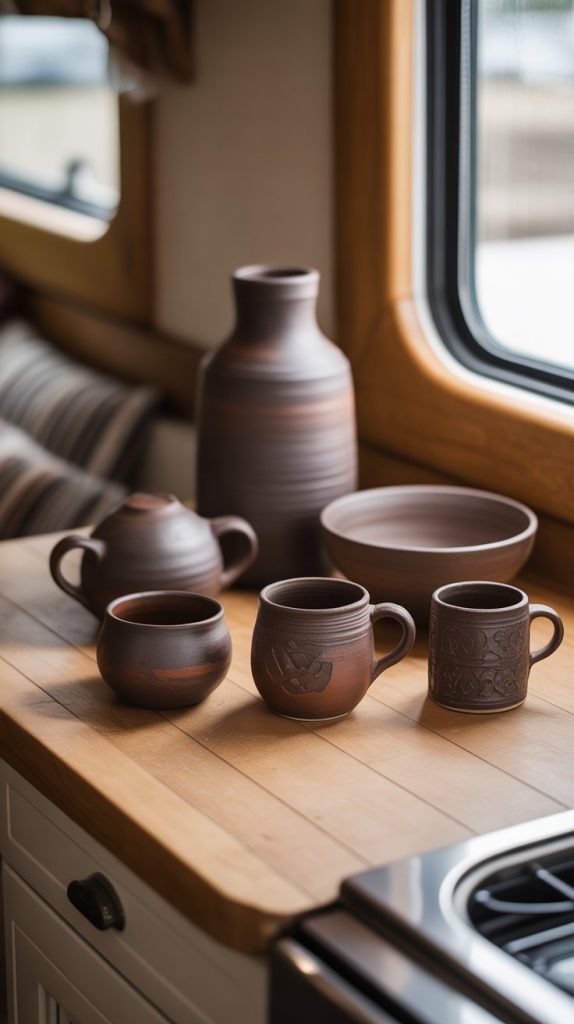 Decorate shelves or countertops with brown ceramic or clay pottery pieces. These natural, handcrafted items add texture and an earthy vibe to your RV interior.