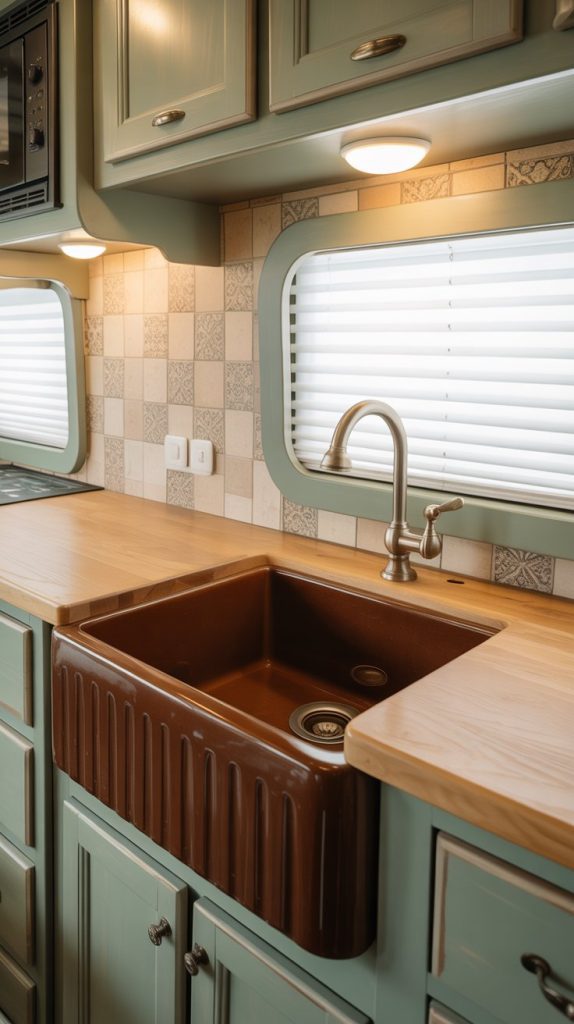 Opt for brown ceramic sinks or fixtures in your RV bathroom or kitchen for a unique, earthy touch. These elements add character and blend well with wooden cabinetry.