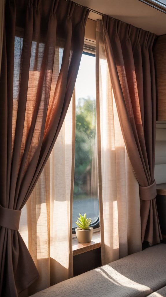 Layering brown curtains with sheer white or cream panels softens the light entering your RV and adds depth to your windows. Choose curtains in warm chocolate or caramel shades to complement your interior color scheme.