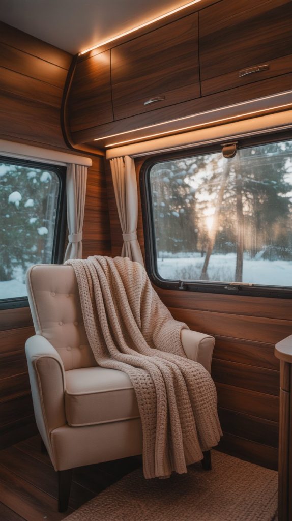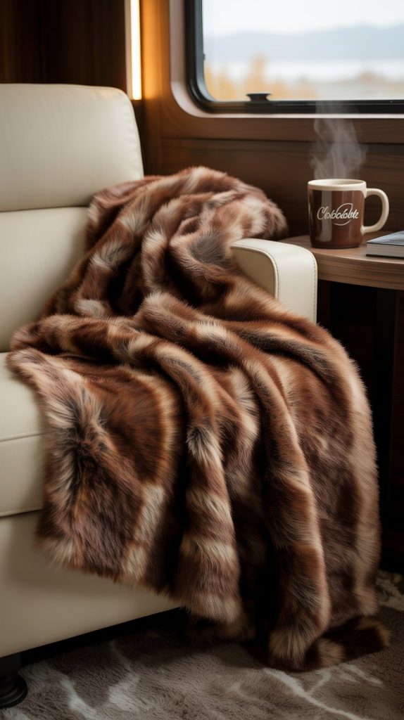 Faux fur throws in brown hues provide a luxurious and cozy touch to your RV interior. Drape them over sofas, chairs, or beds to add warmth and softness, especially during cooler weather.