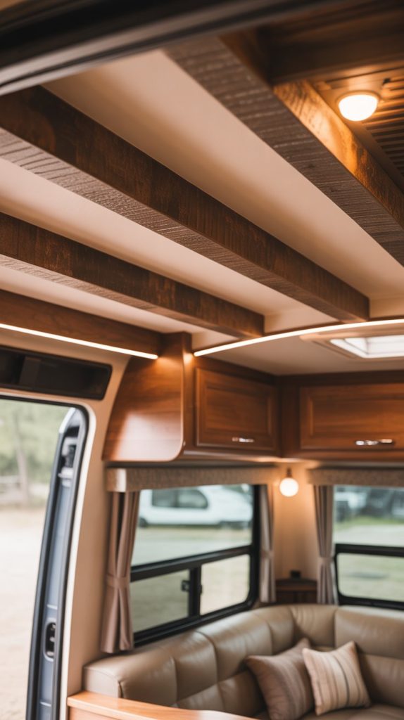 Install faux wood ceiling beams in brown tones in your RV to add architectural interest and a cozy cabin feel. These beams create depth and warmth overhead, enhancing the rustic vibe.