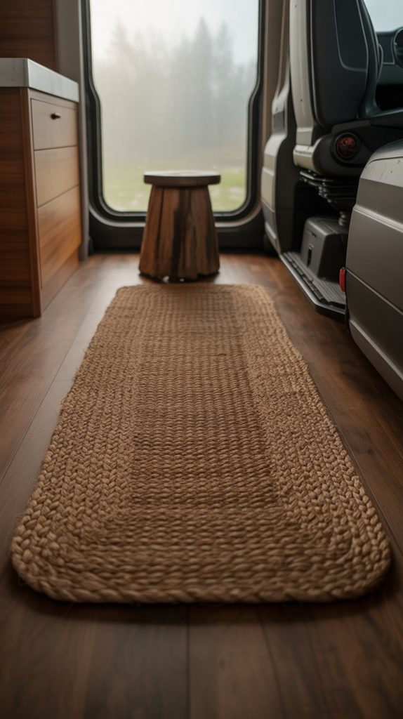 Natural fiber rugs made from jute or sisal in brown tones add texture and warmth to your RV floors. These rugs are durable and easy to clean, perfect for travel lifestyles.