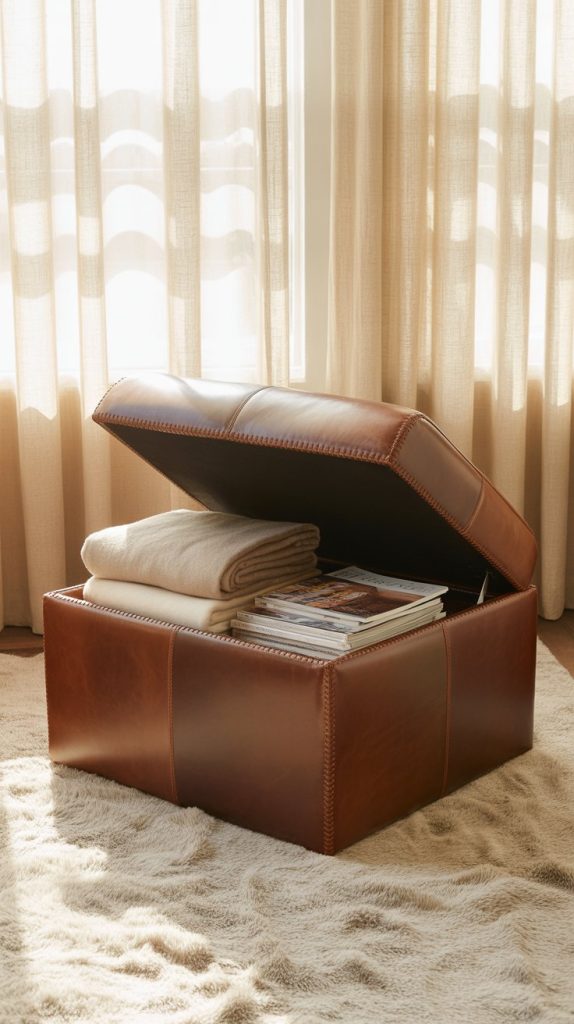 Storage ottomans in brown leather or fabric provide extra seating and hidden storage. They are perfect for stashing blankets, magazines, or other essentials while adding to the cozy aesthetic.