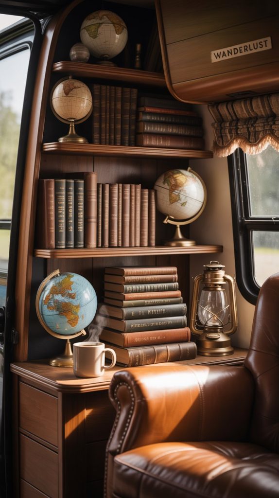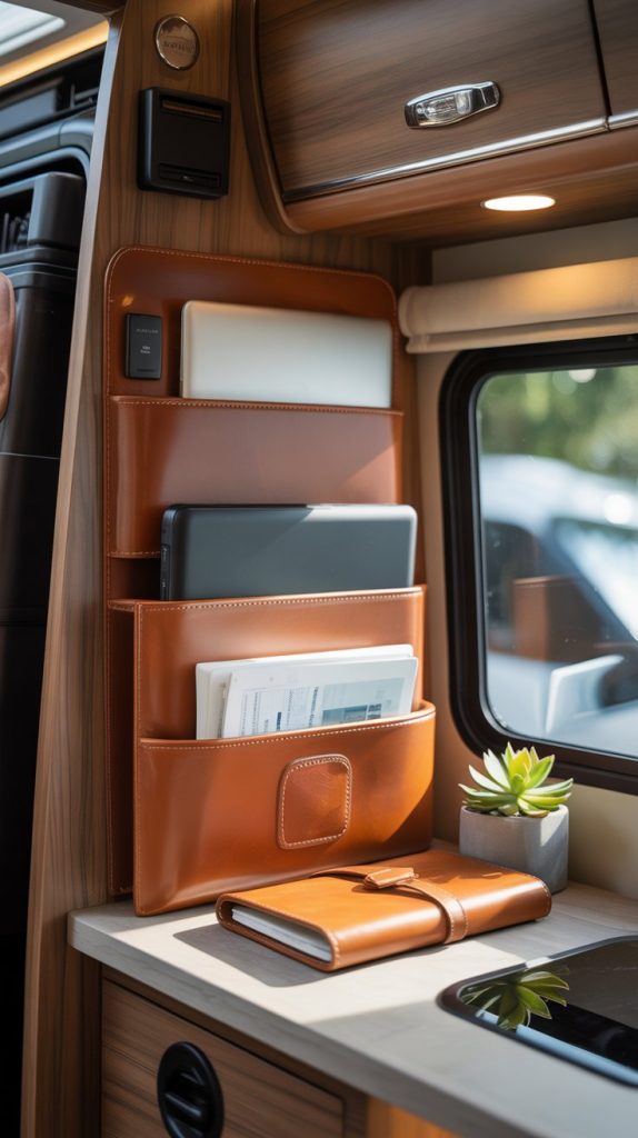Use brown leather cases or organizers for your electronics and paperwork. These practical accessories add a sophisticated touch and help keep your RV tidy.