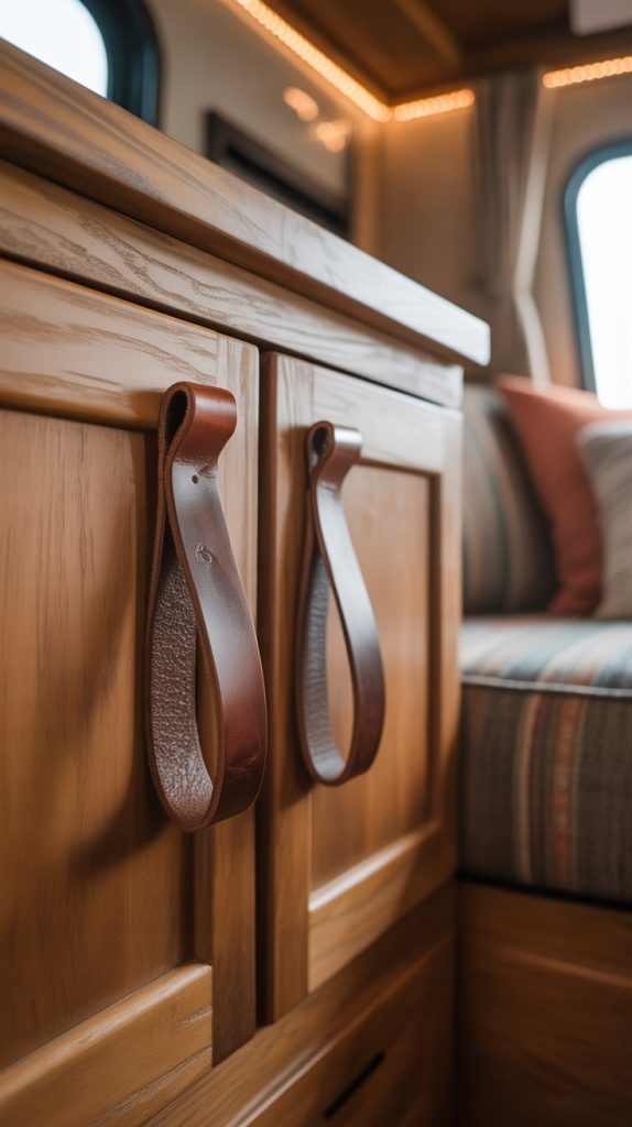 Add brown leather straps as handles for cabinets or drawers to introduce a unique design element. This detail adds texture and a handcrafted feel to your RV interior.