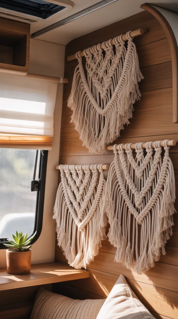 Macrame wall hangings in brown or tan tones add bohemian charm and softness to your RV walls. These handcrafted pieces bring texture and interest without overwhelming the space.