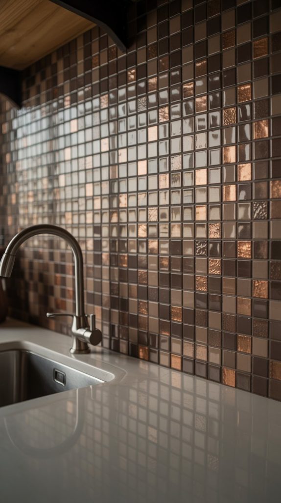A brown mosaic tile backsplash in the kitchen or bathroom adds texture and visual appeal. Choose tiles in varying shades of brown, bronze, or copper for a dynamic and warm effect.