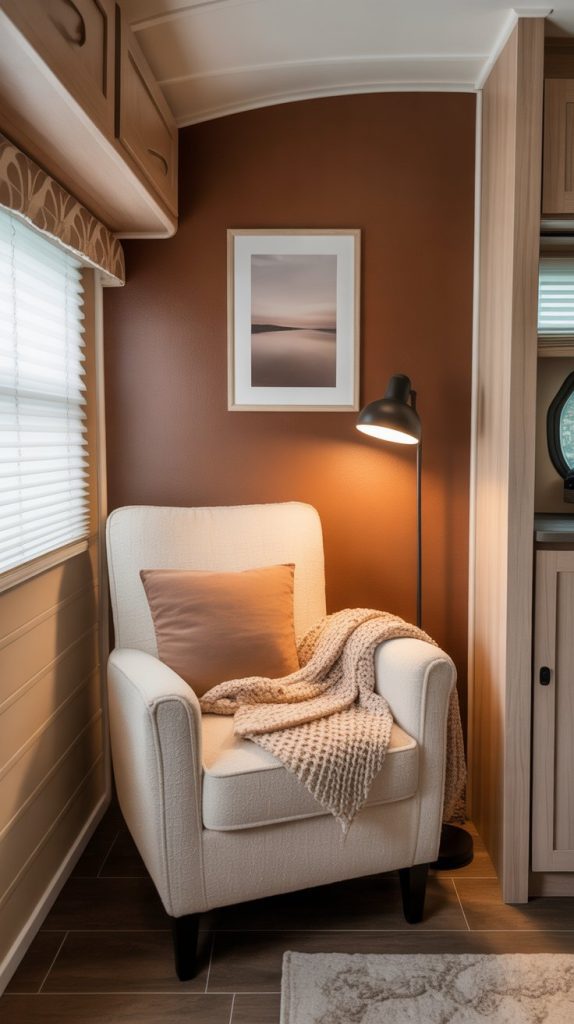 Create a focal point with a brown painted accent wall in your RV living or sleeping area. Choose a warm chocolate or mocha shade to add depth and coziness.