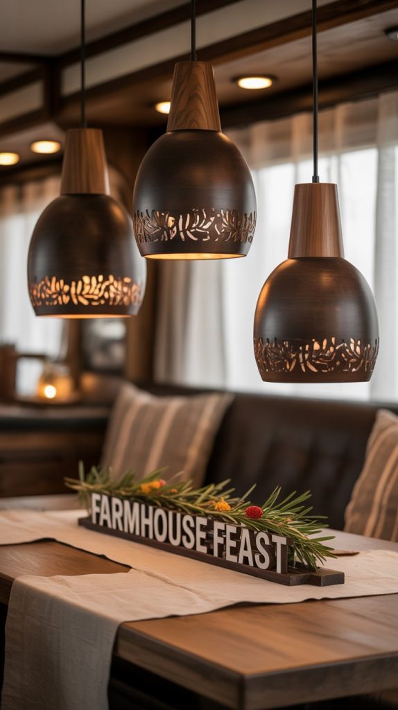 Brown pendant lights with wooden or bronze finishes add character and focused lighting to dining or kitchen areas. They create a warm glow that enhances the cozy atmosphere of your RV.