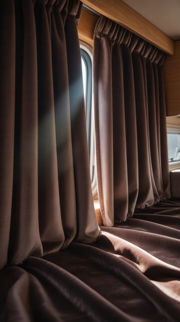 Velvet curtains in deep brown shades add luxury and softness to your RV windows. The fabric’s rich texture enhances the cozy feeling and helps insulate against cold or heat.