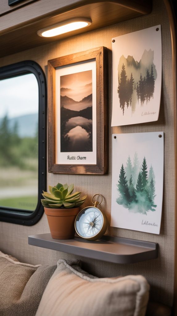 Decorate your RV walls with brown-toned art pieces, such as wooden frames, sepia photographs, or nature-inspired prints. These elements add personality and warmth without cluttering the space.