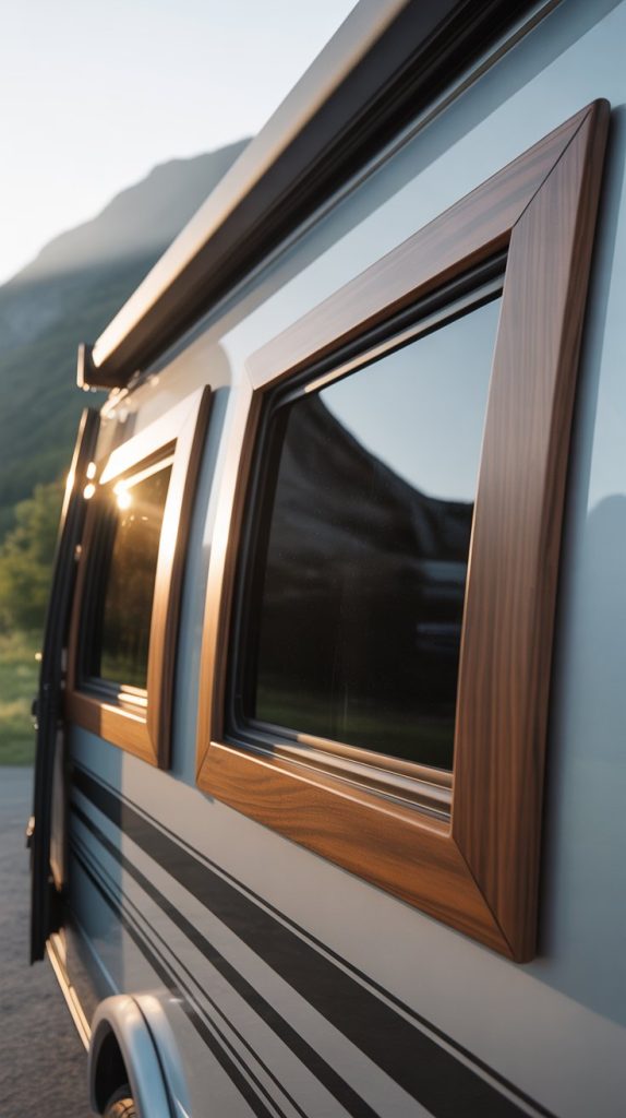 Replace or accentuate your RV window frames with brown wooden trims. This adds architectural detail and warmth while complementing other wood elements inside.