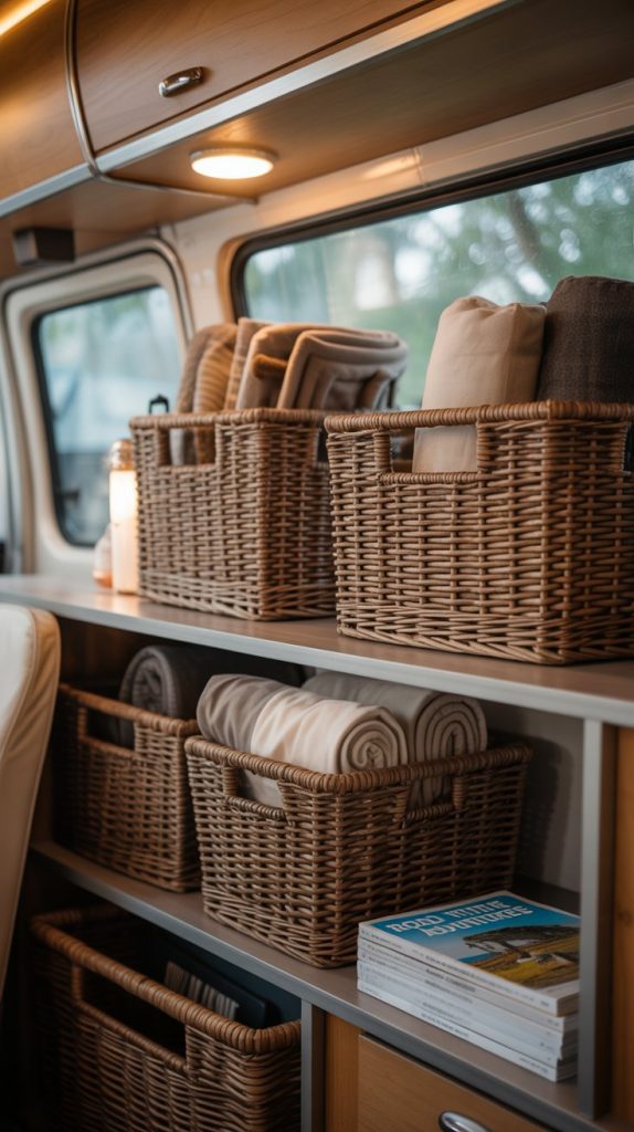 Incorporate brown woven baskets for stylish and functional storage solutions throughout your RV. These baskets add texture and warmth while helping you organize essentials like blankets, magazines, or kitchen supplies.