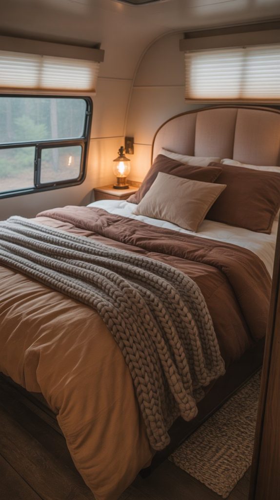 Your RV bedroom is the perfect place to showcase cozy brown bedding and throws that invite rest and relaxation. Opt for layered bedding in various brown shades, from light tan to deep chocolate, combined with textured fabrics like knit blankets or faux fur throws.