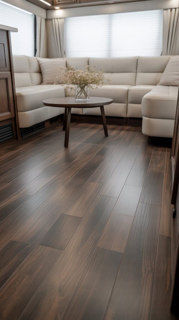 Installing dark brown hardwood or laminate flooring can ground your RV interior with a timeless, elegant look. Dark floors hide dirt well and complement lighter walls and furniture.