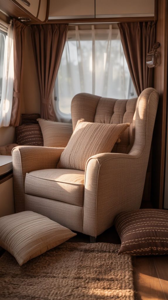 Incorporating earthy brown textiles such as curtains, cushions, and rugs can tie your RV’s interior together while adding softness underfoot and around seating areas. Look for fabrics with natural textures like linen, wool, or cotton blends that complement the brown color scheme.