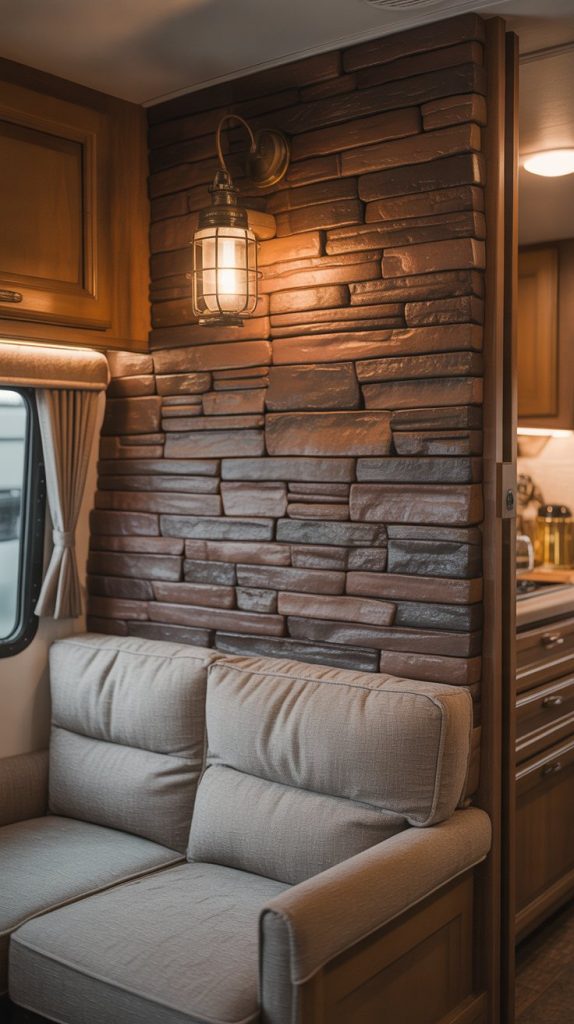 A brown stone or faux stone accent wall adds a rustic, earthy touch to your RV’s interior. This feature works well behind the sofa or bed, creating a natural focal point that enhances the cozy atmosphere.