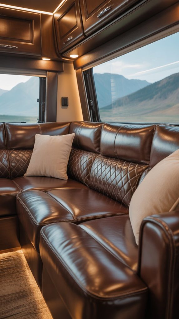 Leather seating in deep brown shades is both stylish and practical for RV interiors. It’s durable, easy to clean, and adds a sophisticated touch that complements wooden accents. Choose plush leather sofas or recliners that invite relaxation and provide comfortable seating for family and guests.