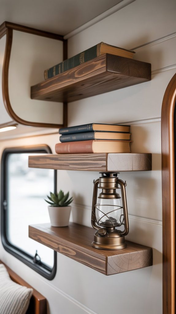 Install rustic floating shelves in brown wood tones to display books, plants, or decorative items. These shelves add storage without taking up floor space, ideal for compact RV interiors.