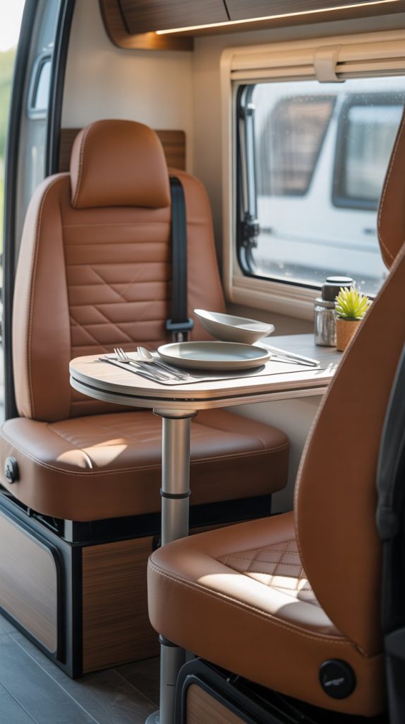 Dining areas in RVs can benefit from soft brown leatherette chairs that combine comfort with easy maintenance. Leatherette is resistant to spills and wear, making it a practical choice for the road. The warm brown tone adds an inviting feel to your eating space.