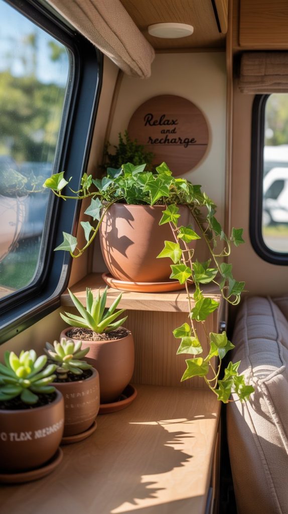 Incorporate brown ceramic or terracotta planters with greenery to bring life and warmth into your RV. Plants add freshness and contrast beautifully with brown interiors.