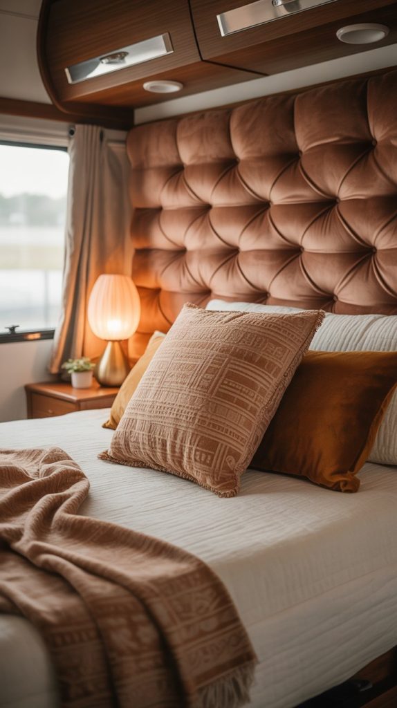 A brown upholstered headboard in your RV bedroom adds softness and visual interest. Choose fabrics like suede or velvet in warm brown tones for a plush, inviting feel.
