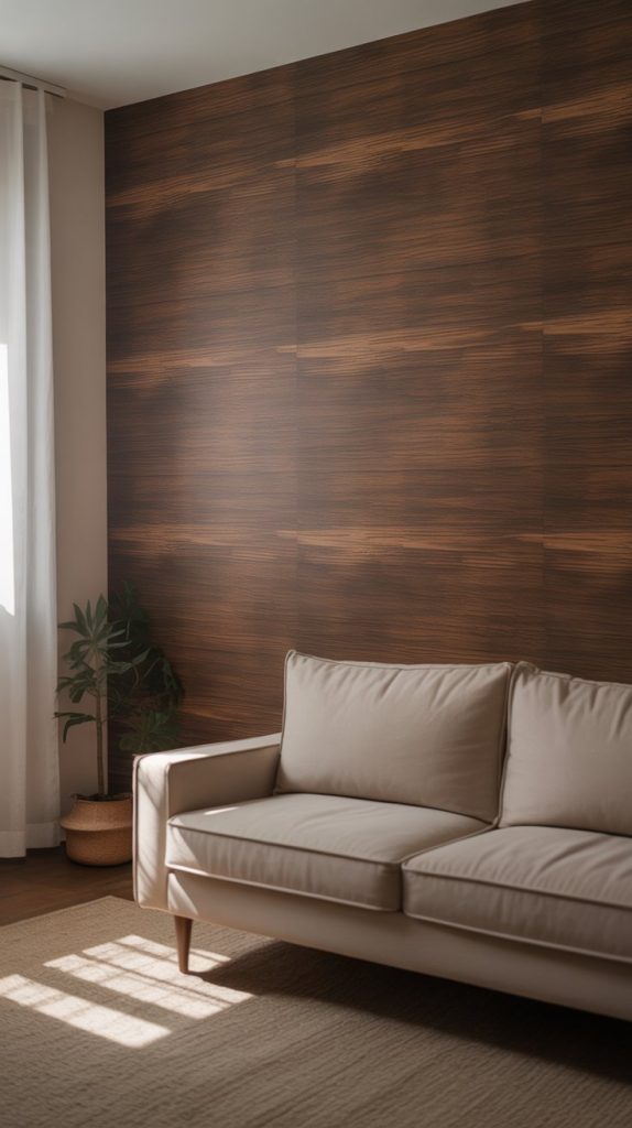Use brown wood grain wallpaper to add the look of natural wood without permanent installation. This option is perfect for renters or those who want to change decor easily.