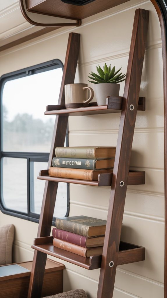 Use a brown wooden ladder shelf for stylish storage and display. This piece adds vertical interest and rustic charm to your RV interior.