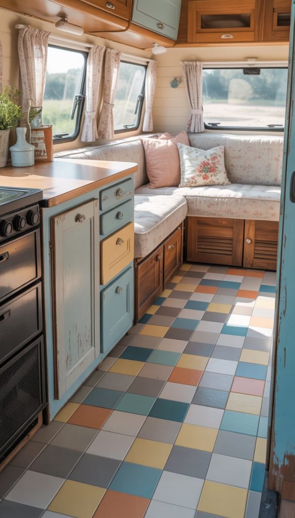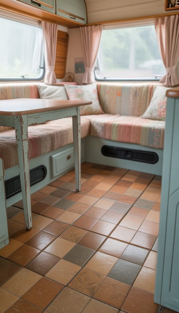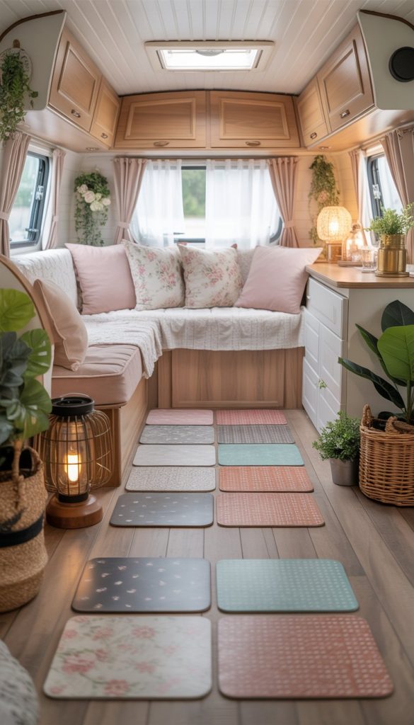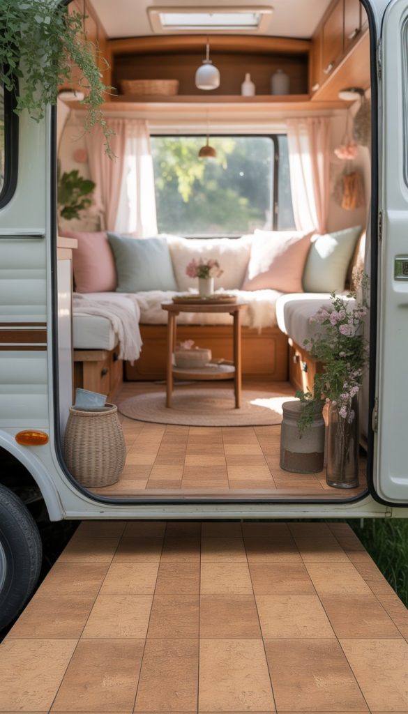 Cork flooring tiles are soft and warm under your feet. They give a cozy feel to your shabby chick camper without costing a lot. Cork is also naturally resistant to mold and mildew, which is great for a small space like a camper.