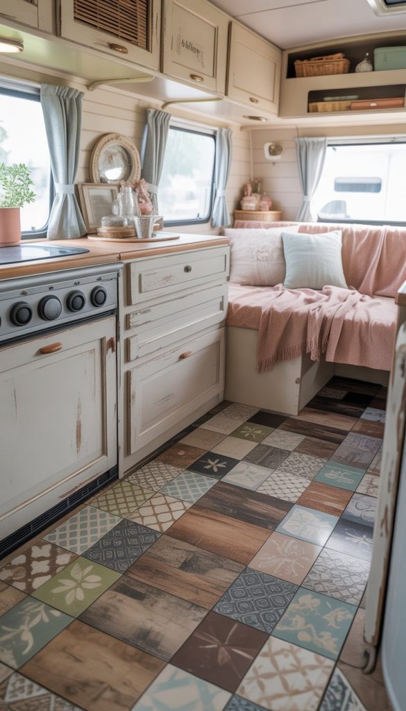 Home Decorators Collection vinyl is a great choice if you want affordable and stylish flooring for your shabby chic camper. It comes in many designs, like wood and stone looks, so you can find one that fits your style. The vinyl is also easy to install, which saves time and effort.